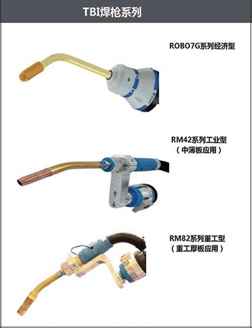 TBI焊枪系列包括ROBO7G系列经济型、RM42系列工业型(中薄板应用)、RM82系列重工型(重工厚板应用)。